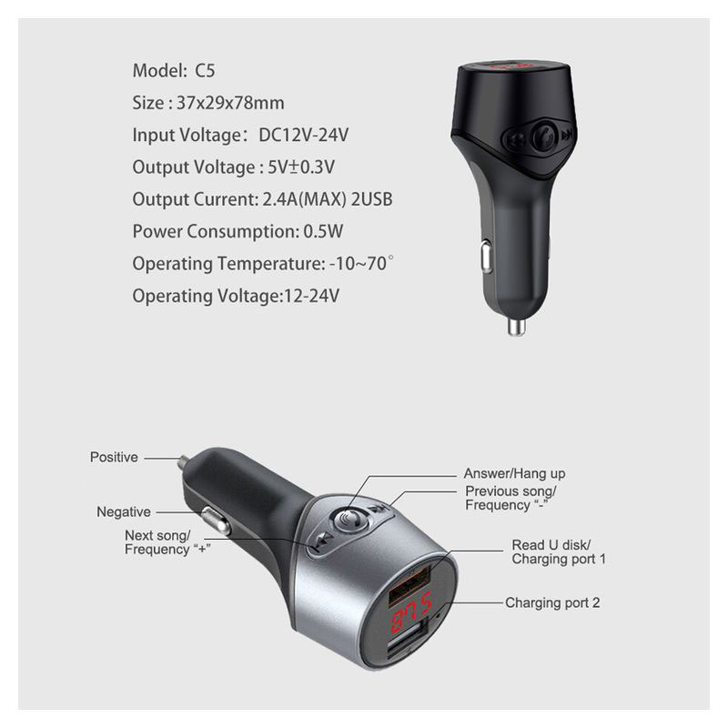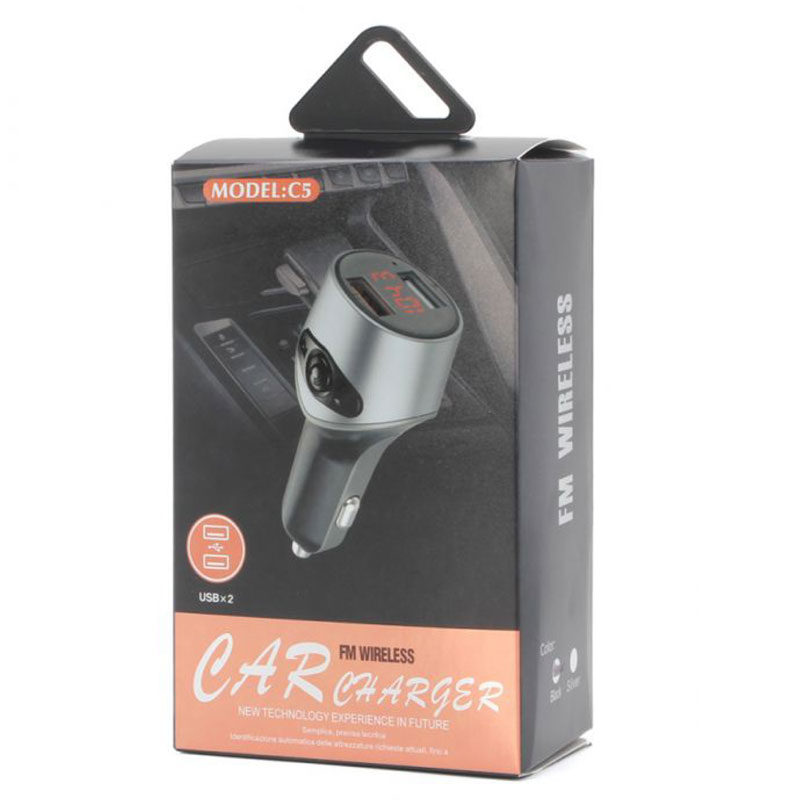 Multifunkcionalni Bluetooth FM predajnik za auto — adapter koji se uključi u upaljač (12 V) i poveže sa telefonom ili drugim Bluetooth uređajem da bi se slušala muziku kroz auto radio.