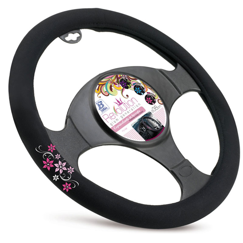 Navlaka za volan ,crna sa roze cvetom .Precnik 38 cm.