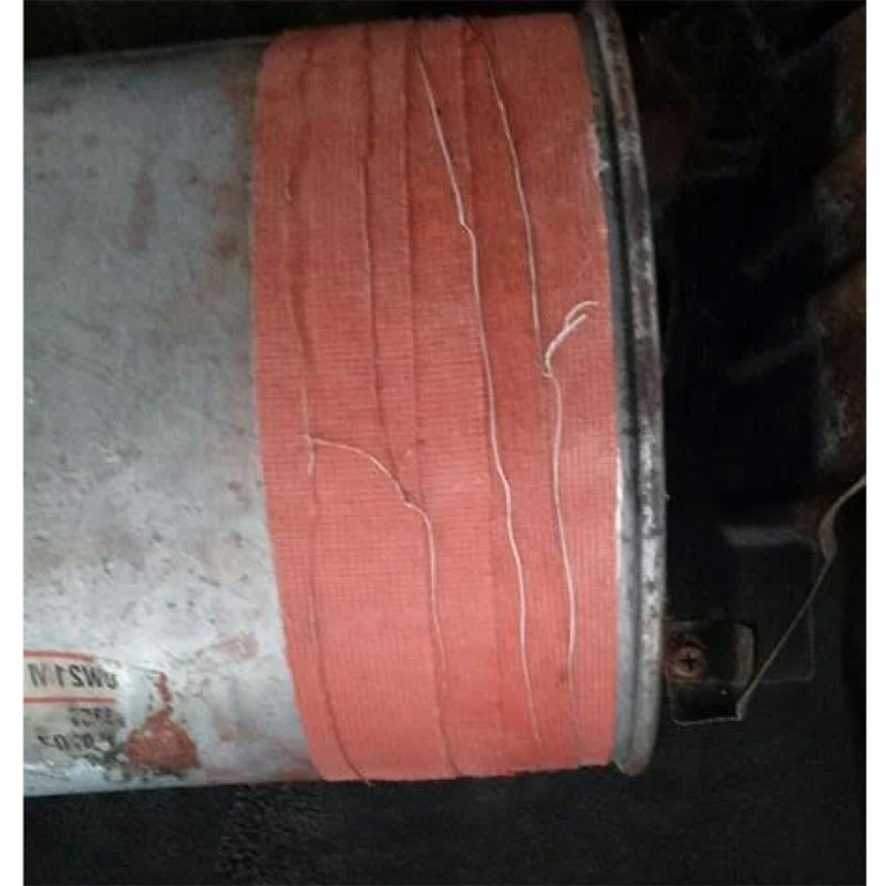 Očistiti prljavštinu i ukloniti rđu sa oštećenih mesta. Postaviti bandaž traku preko oštećenja. Navlažiti traku vodom dok ne postane savitljiva. Ne umakati bandaž traku u vodu! Čvrsto obmotati traku oko cevi (bez istezanja) sa preklapanjima od 25 mm kako bi se dvostruko pokrilo oštećenje. Fiksirati bandaž traku žicom kao privremenom potporom. Ostaviti da se stvrdne preko noći ili polako pokrenuti motor da bi se ubrzalo vreme sušenja. Izbegavati preterano pokretanje motora dok se potpuno ne stvrdne.
