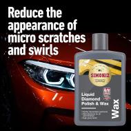 Simoniz tečni dijamantski vosak i polir je formula dvostrukog dejstva koja sadrži blage abrazive, posebno dizajnirane da smanje pojavu mikro ogrebotina i vrtloga na farbi vozila. Sadrži karnauba vosak koji ostavlja trajan, ultra dubok sjaj. Blago abrazivno za sve završne obrade boje, nežno podmlađuje farbu ostavljajući visok sjaj. Za sve metalne, sedefaste i moderne farbe. Bez rastvarača, ne ostavlja bele ostatke. Simoniz dijamantski vosak i polir uklanja nesavršenosti i dodaje visok sjaj svakom vozilu. Pružajući dugotrajnu zaštitu i nenadmašan sjaj, ovaj dijamantski vosak i polir tretira manje nesavršenosti i stvara glatku, sjajnu površinu koja blista na sunčevoj svetlosti. Sa dugotrajnom izdržljivošću i izuzetnim vodoodbojnim svojstvima, tretman Dijamantskim voskom i polirom osigurava da vozilo ostane zaštićeno od kiše, UV zraka, prljavštine sa puta i zagađivača iz okoline.