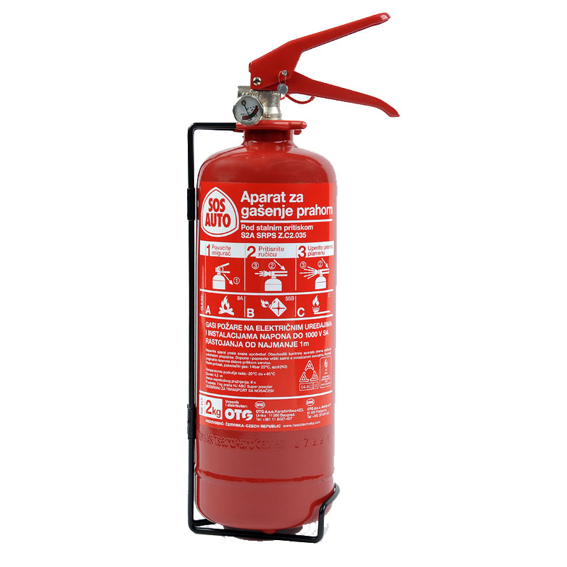 Aparat za gašenje prahom 2kg. Gasi požare na električnim uredjajima i instalacijama napona od 1000V sa rastojanja najmanje 1m. Sertifikat o ispitivanju TOC -12-3448/2