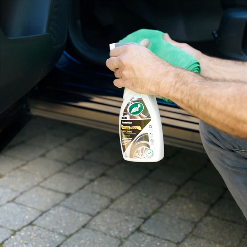 Unutrašnja plastika, guma i vinil Dobro protresti bocu. Naprskati direktno na krpu od mikrovlakana ili na površinu. Rasporediti po površini dok sredstvo ne bude ravnomerno pokriveno i kondicionirano. Lagano obrisati drugim, čistim peškirom od mikrovlakana. Gume i ukrasi Uveriti se da su sve površine čiste i suve. Dobro protresti bocu. GUME: Obilno prskati kružnim pokretima oko zida gume, a zatim rasporediti pomoću aplikatora od pene ili krpe od mikrovlakana. UKRASI: Naprskati na krpu od mikrovlakana ili jastučić i ravnomerno naneti na površinu. Ostaviti da se potpuno osuši pre nanošenja drugog sloja za bogatiju crnu završnicu.